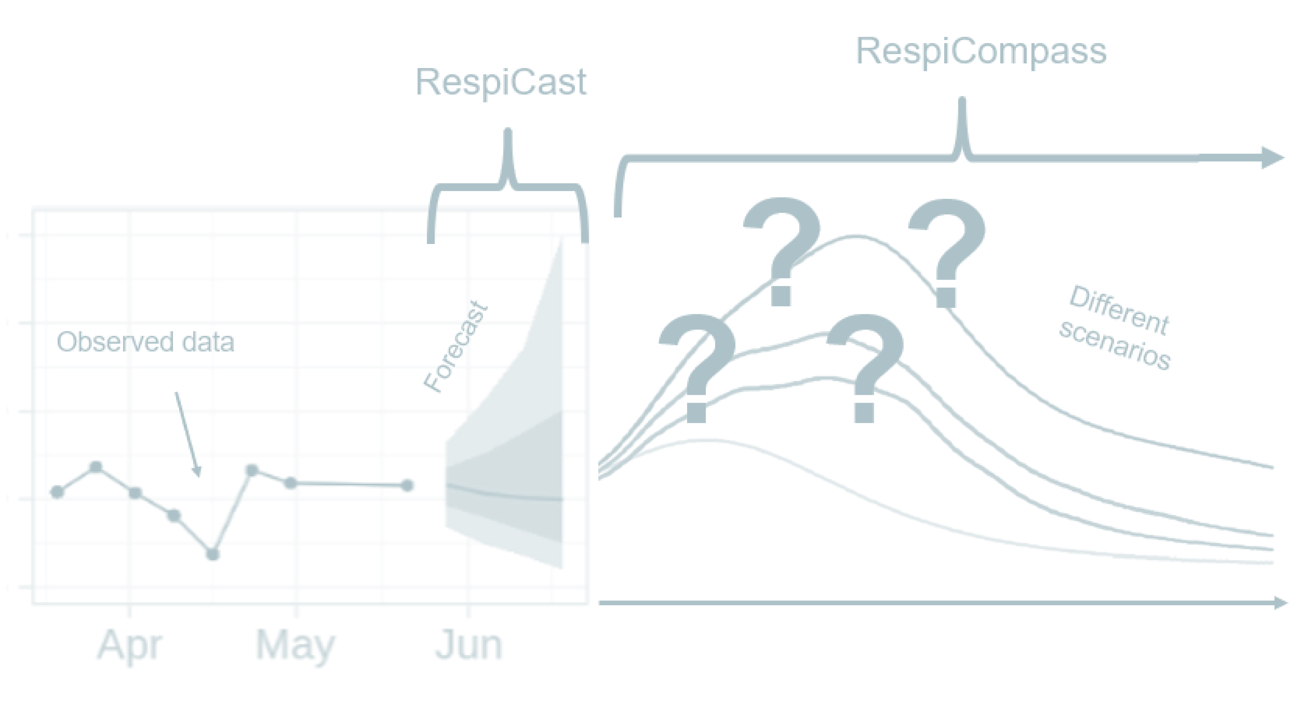 RespiCompass is ECDC’s scenario modelling hub for viral respiratory diseases. Unlike forecasts, which provide short-term predictions based on trends in observed data, scenario modelling explores mid- to long-term projections that incorporate specific uncertainties. These scenarios are designed to support policymakers by providing insights into the potential impact of public health interventions. RespiCompass brings together multiple modelling groups working collaboratively, with input from disease experts in respiratory virus surveillance. We apply ensemble approaches that combine projections from different modelling groups using a unified set of scenario parameters. This approach allows us to account for uncertainties across diverse modelling methodologies, embedding these uncertainties directly within the ensemble results.